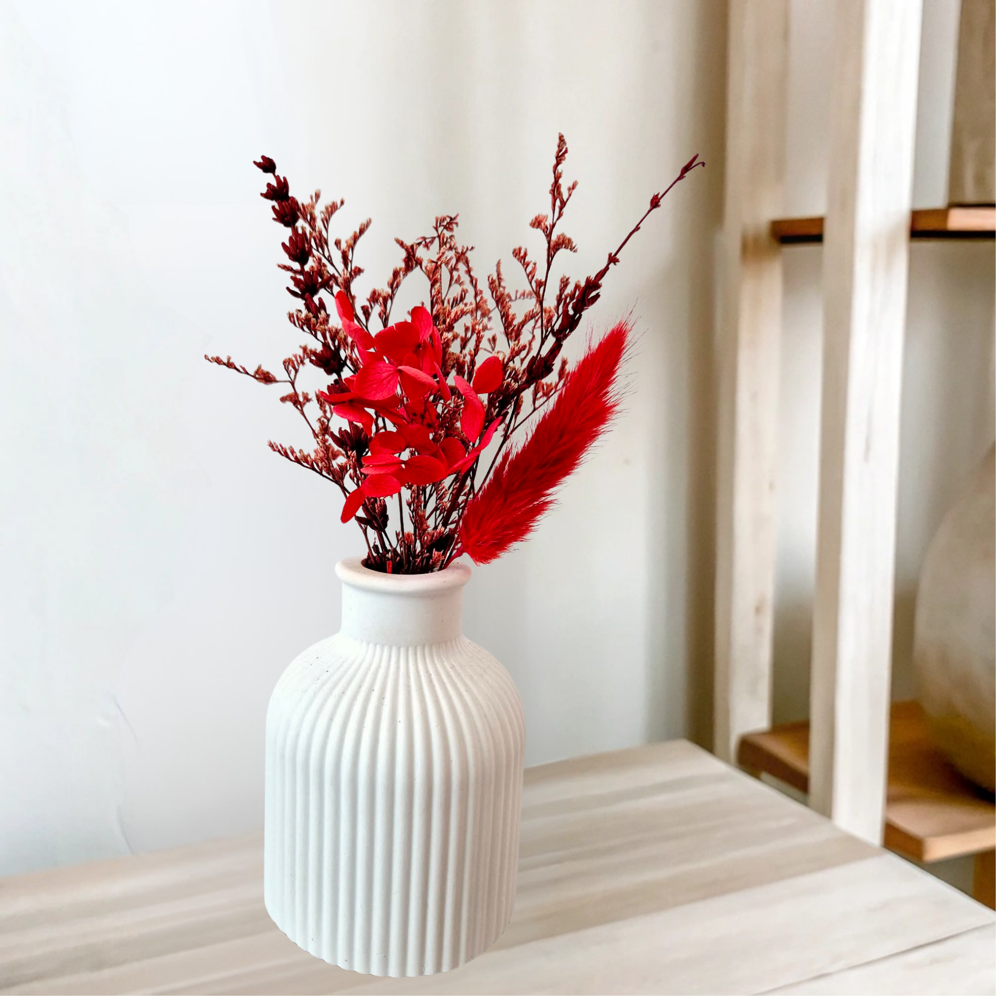 Die schlichte weiße Farbe passt perfekt zu jedem Einrichtungsstil – von modern über skandinavisch – und setzt Trockenblumen besonders schön in Szene. Durch ihre matte, feine Oberfläche wirkt die Vase zeitlos und dekorativ zugleich.